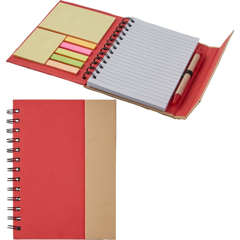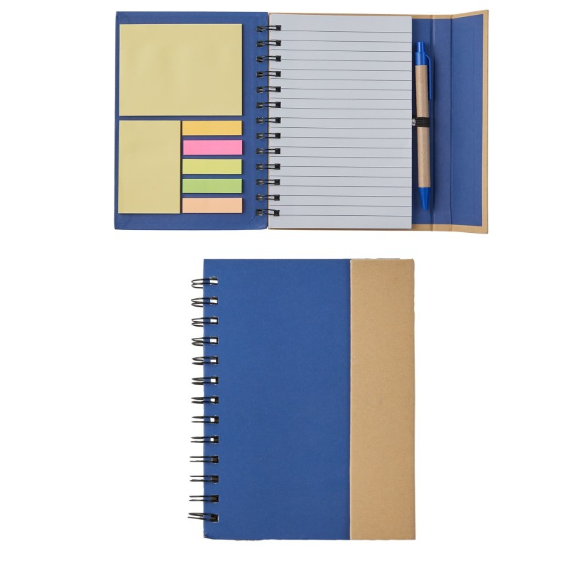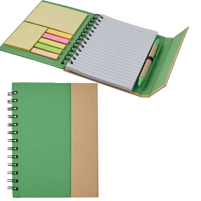 Constructed of kraft paper, this eco-friendly notebook really packs a punch. This 5″ x 7″ lined 70 sheet spiral notebook contains a matching paper barrel pen, 25 sticky flags, 25 sheets of 4″ x 3″ sticky notes plus 25 sheets of 3″ x 2″ sticky notes. Note book is held close with a magnetic flap. 7 1/8″ H x 5 1/2″ W x 5/16″ D
