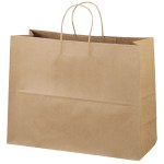 The Eco Vogue is made from brown kraft paper and has twisted paper handles and a serrated top. The eco-friendly bag is made from 100% recycled paper with a minimum of 60% recycled post-consumer content. 16″ W x 6″ D x 12″ H