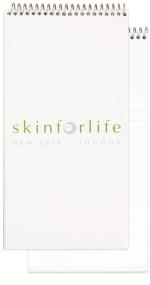 This notebook features a white flexible cover with clear coat on outside front and 18 Lb. white tablet bond sheets with light blue 11/32″ wide rules on both sides. Please note that an imprint is not available on inside sheets. Comes coil bound on top. 4″ W x 8 1/4″ L