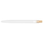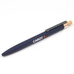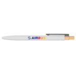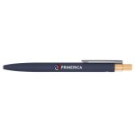 Sustainable ballpoint pen with recycled aluminum barrel, bamboo button, metallic clip, and soft-touch rubber coating for eco-smart writing.