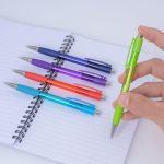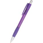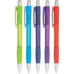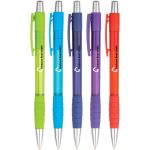 These custom pens are attention-grabbers! They feature a translucent barrel with a molded rubber grip to match the barrel, polished silver accents, and a retractable action. Plus, they are affordable.. Affordable, personalized pens with slim profile design. Molded rubber grip matches colored barrel. Available in a variety of colors with polished silver plunger & tip. Retractable pen with medium black ink. Screen Printed message or logo. Complies with Prop 65.
