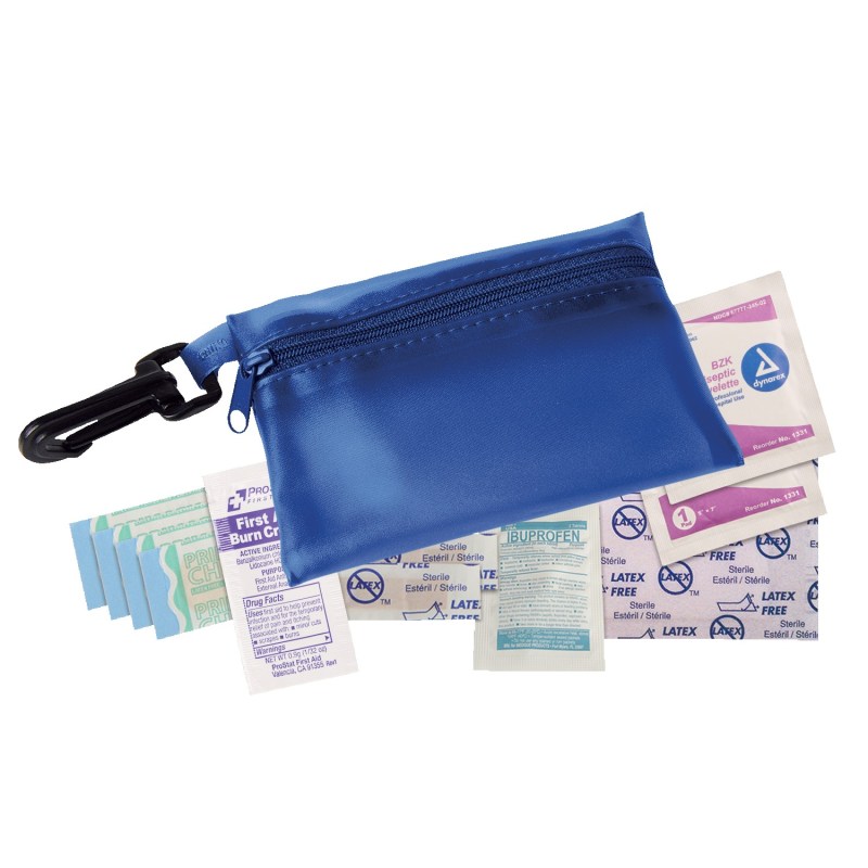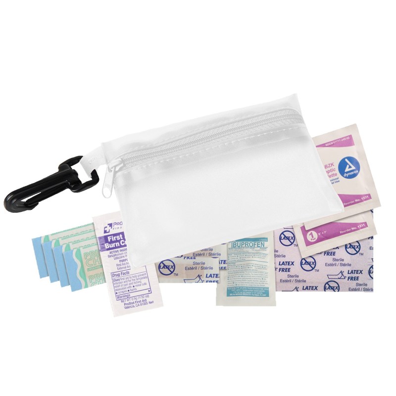 Colorful, translucent vinyl pouch with clip includes 4 latex-free bandages, 2 snip bandages, 2 antiseptic towelettes, 2″x3″ adhesive pad, first aid cream pocket and 200 mg ibuprofen pocket. Complies with Prop 65. 3 3/8″ W x 4 3/4″ H x 1/4″ D