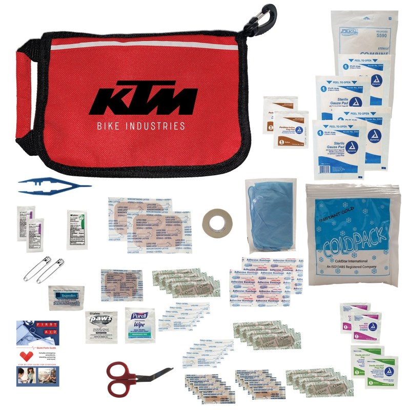This kit is just what you need for a fantastic promotion! Packed full of first aid essentials this kit has what you needKit includes: 1 Pair Scissors, 1 ABD Pad 5×9, 1 Antimicrobial Wipe, 2 Triple Antibiotic Ointment 0.5g, 1 Ibuprofen, 2 iodine Swabs, 2 Safety Pins, 1 Blister Bandage, 1 Hand Sanitizer Packet, 1 Instant Ice Pack, 1 First Aid Basics Guide, 12 Bandages10 Junior Bandages, 10 Butterfly Bandages, 2 Knuckle Bandages, 1 Tweezer, 1 Pair Nitrile Gloves, 4 Gauze Pads, 1 Roll Medical Tape, 1 Antibacterial Wipe, 2 Antiseptic Swabs, 2 Alcohol PadsRipstop nylon first aid kit packed with a variety of high quality first aid products.Handy front pocket, durable carabiner and a handle are some of the features of this bag…not to mention the carefully designed first aid fill. 7″ H x 5.5″ W