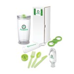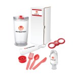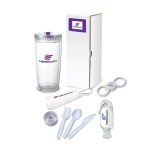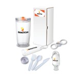 The Excursion 4-Piece Picnic Gift Set is the perfect gift set for picnic lovers packaged together in a customized gift box! Drink your favorite iced tea or latte in the double walled 22 oz. hot/cold tumbler. The bottle opener spinner has a smooth spinning design and is a picnic go-to item as it has dual steel inset bottle openers. Use this opener to quickly and easily open your favorite sodas or beers while enjoying your picnic. Use the 1 oz. hand sanitizer to keep your hands clean and you can hang it from your backpack or bag as it comes with a handy carabiner clip. This set also includes a 3-piece utensil set stored in a plastic case with carabiner clip attachment. The cutlery set includes a polypropylene fork, spoon and knife. It’s easy to use and travel with. Think of the Excursion 4-Piece Picnic Gift Set for all your picnic-loving friends and employees. Ground shipment only. Complies with Prop 65. 3 1/2″ W x 7 3/8″ H x 3 1/2″ D