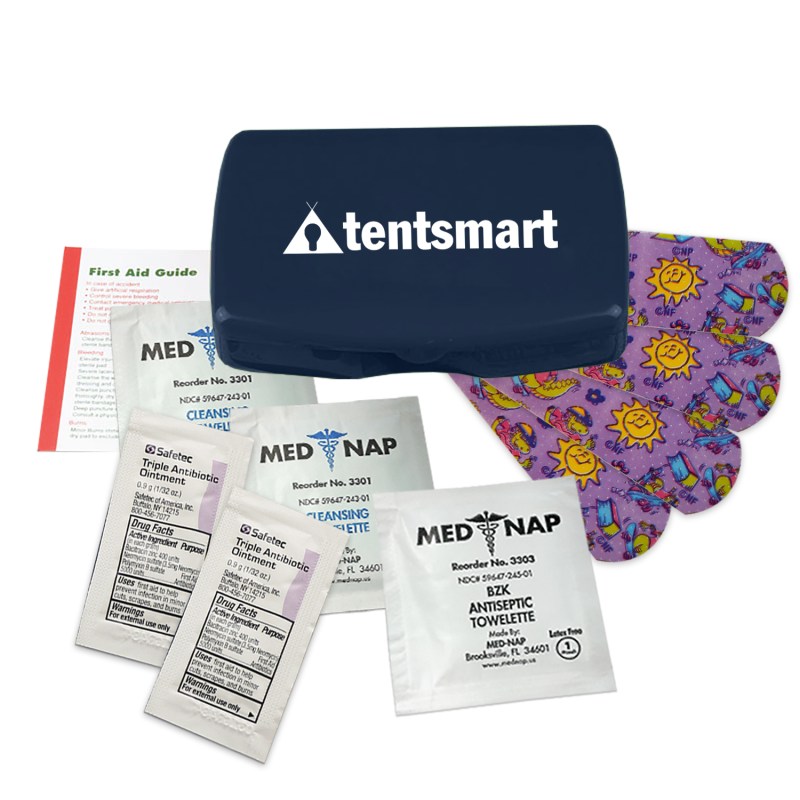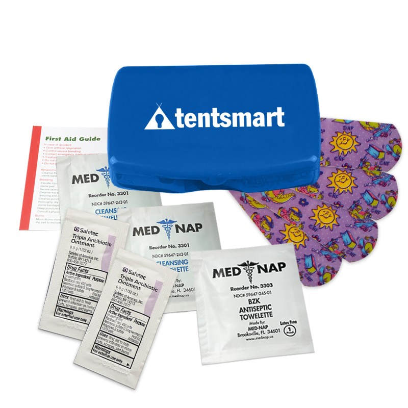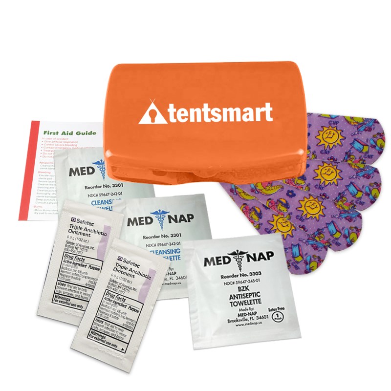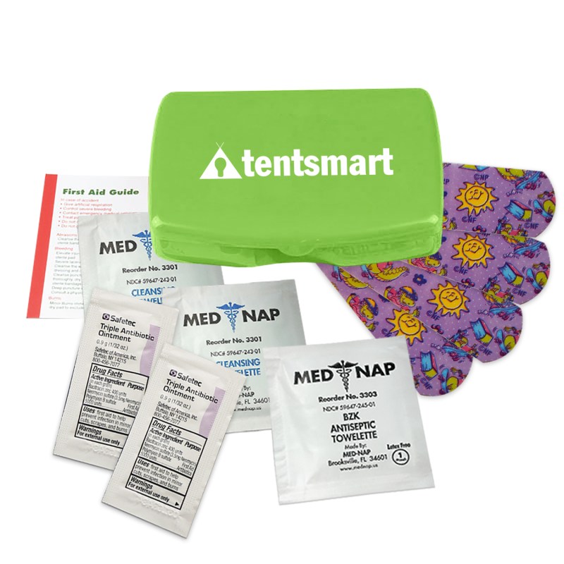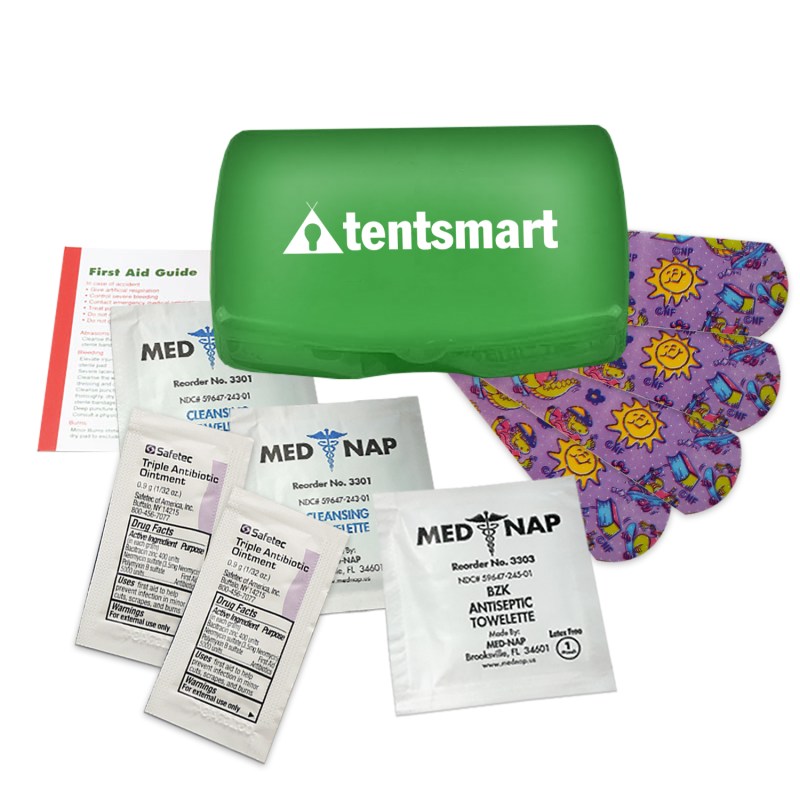 Mothers little refillable safety kit fits in a purseContains four latex free?character bandages. two triple antibiotic ointment packets. antiseptic towelette. two wash up towelettes and a first aid guideThis item is not appropriate for children 14 years or younger without parental supervisionIndividual portioned ingredients are labeled by the manufacturer with instructions for proper usage. Complies with ANSI, CPSIA, FDA, Prop 65. 3.125″ H x 4.25″ W x 0.875″ D