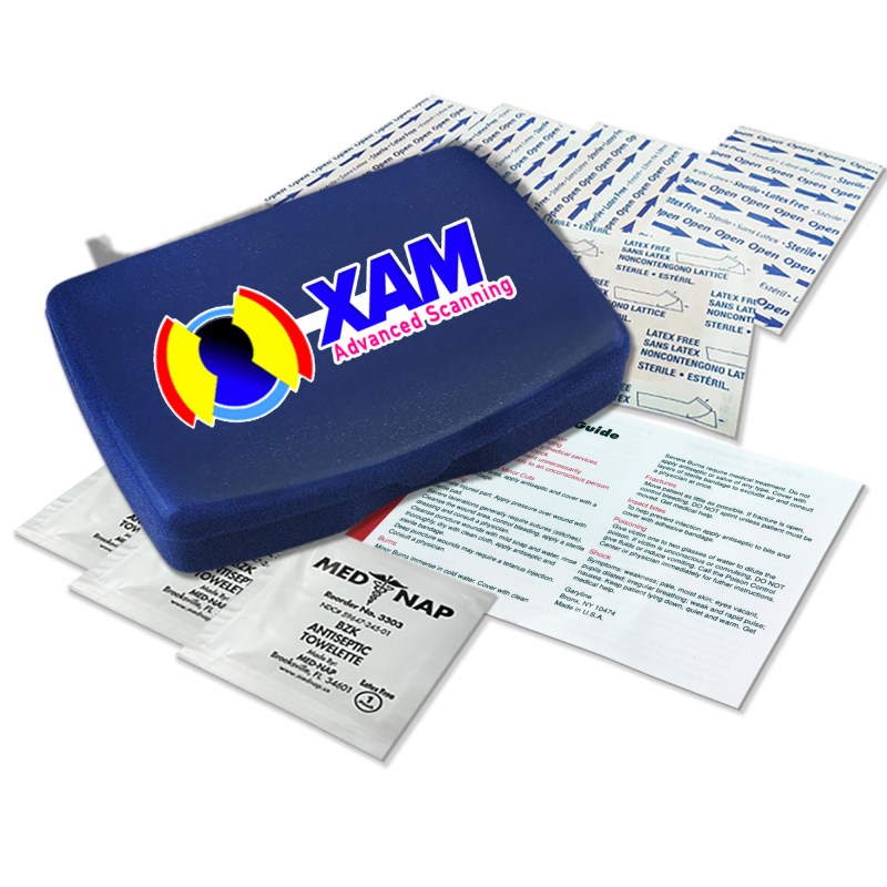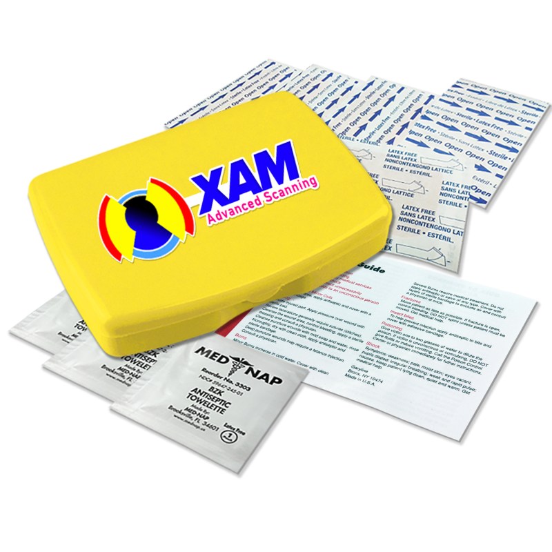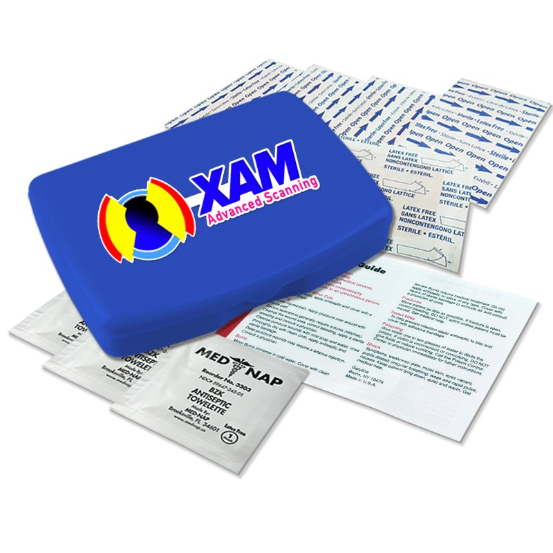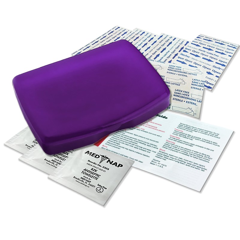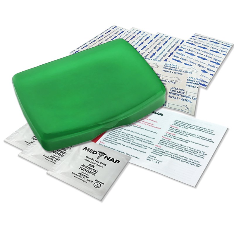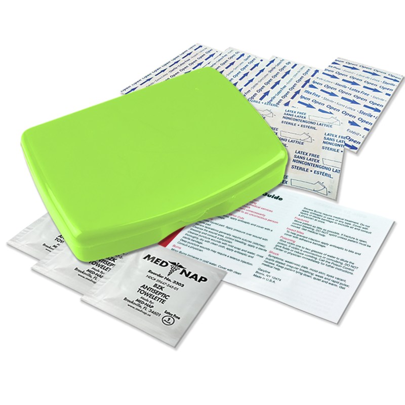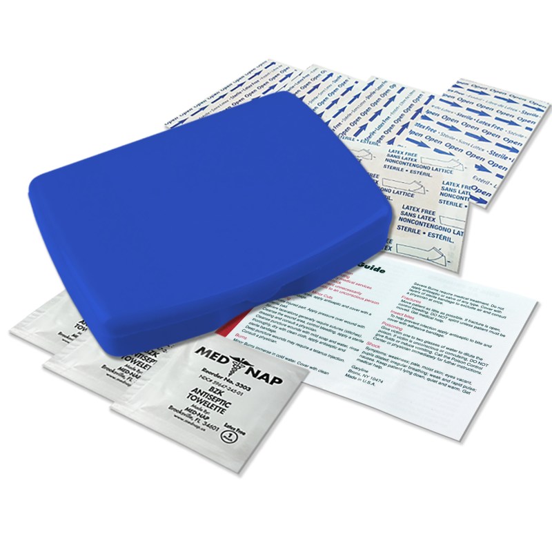 Durable living hinge box contains six latex free?adhesive bandages. five junior bandages. three antiseptic towelettes. extra large latex free bandage and?a?first aid cardDon’t be caught unprepared in an emergencyThis first aid kit comes in a durable hinged box that fits easily into backpacks. purses. and glove compartments. Complies with ANSI, CPSIA, FDA, Prop 65. 3.125″ H x 4.25″ W x 0.875″ D