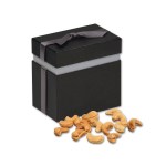 These jumbo, great tasting, freshly roasted, extra fancy cashews are some of the very finest in the world. We roast them carefully to make sure they are extra crunchy, then lightly salt them to bring out that real, honest-to-goodness flavor. Cashews are a great source of magnesium, selenium, zinc and iron. Each box contains five-ounces. The shimmering black gift boxes are complete with a pewter ribbon and foil-stamped on the front with your logo in silver. Complies with CPSIA, FDA, Prop 65. 3.75″ L x 2.5″ W x 3.75″ H