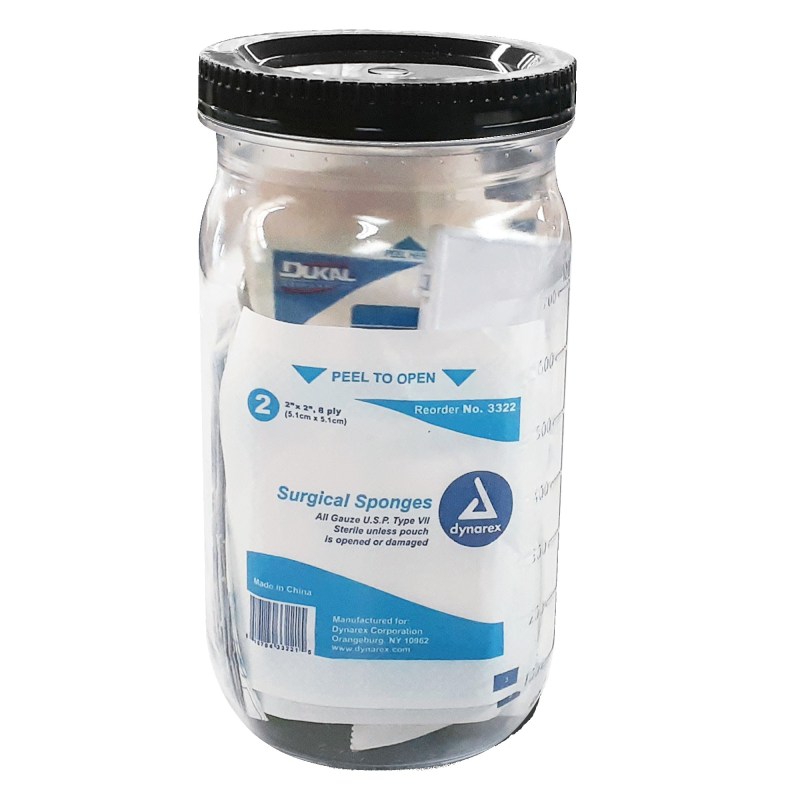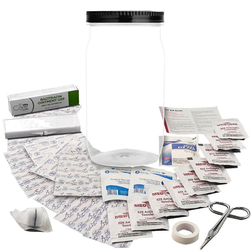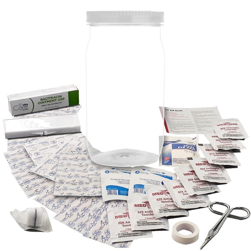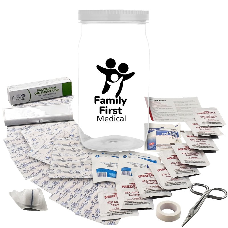 This 27 oz. multi-purpose Tritanâ„¢ Mason Jar with Screw lid contains sixteen latex-free adhesive bandages, ten latex-free junior bandages, nine antiseptic towelettes, 1/2 oz. first aid cream, 1″ x 4.1″ yard conform bandages, two gauze pads, two extra-large latex-free bandages, eye pad, tape, forehead thermometer, scissors, and a first aid guide. This item is not appropriate for children 14 years and younger without adult supervision. Custom kits available. Contact us for more details. Complies with ANSI, CPSIA, FDA, Prop 65. 3.5″ L x 3.5″ W x 6.5″ H