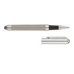 The Bettoni Fasciare solid brass rollerball pen features a woven steel barrel, cap off design, and a chrome cap and clip. It also has a durable conductive fiber capacitive stylus tip that works with touch screen devices and a German-made black ink refill. Complies with Prop 65. 5/8″ W x 5 5/8″ H x 1/2″ D