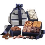 This stunning tower is the perfect way to send your greetings, say “Thank you,” or show your appreciation! It holds the most sumptuous treats one could ever desire, including a dazzling array of gourmet chocolates with a pop of fresh-roasted nuts. A navy ribbon foil-stamped in silver with your logo ties it all together. Serves 18-24. Complies with CPSIA, FDA, Prop 65. 7.375″ L x 7.375″ W x 6.75″ H