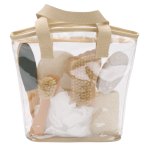 Sponge scrubber, padded sponge with elastic strap, loofah on rope, pumice stone, wood-handled callous smoother, small handled brush, foot brush all in a clear zippered bag with handles. Complies with Prop 65. 10 1/2″ W x 10″ H x 3″ D