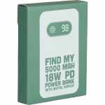Find My 5000 mAh 18W PD Power Bank with Digital Display features a rechargeable lithium polymer battery (18.5Wh) for charging smartphones and other devices at 18W charging speed. It also features with digital display to show power capacity. Type-C Input/Output Port: 5V/2A, 9V/2A, 12V/1.5A (18W max); USB-A Output: 5V/2.1A, 9V/2A, 12V/1.5A (18W max). Compatible with Apple devices utilizing the Find My App, it ensures you are always in control with this MFi certified Find My Power Bank. With step-b. 4.33″ D x 2.51″ W x 0.47″ H