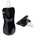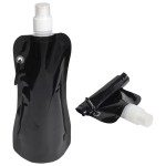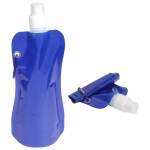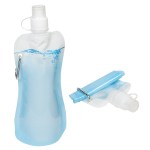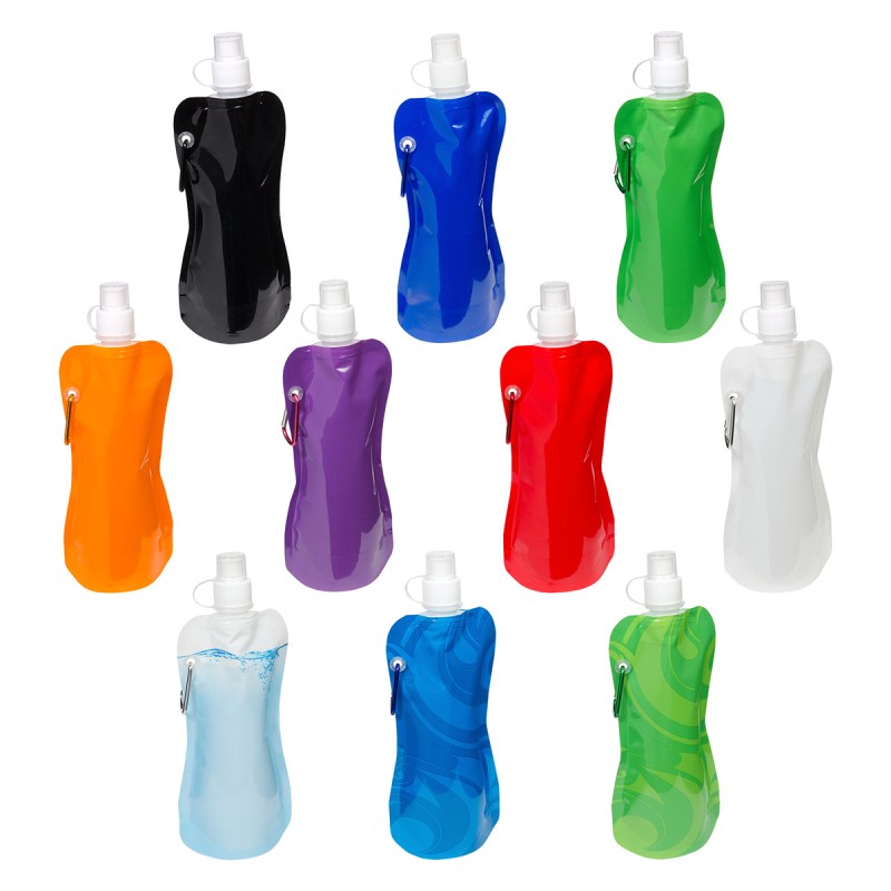 Flex Foldable 16 oz Water Bottle with Carabiner is made from PE+PA(Nylon)+PET and is BPA free and FDA certified. Easy to use pull open top. Can be rolled, folded or flattened when empty and can be frozen to keep water cold. Has color compatible carabineer clip for easy portability . Hand wash only. Complies with FDA, Prop 65. 4.75″ W x 10.5″ H