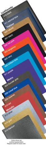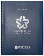 This calendar planner features a flexible leatherette or textured paper cover with 2 round corners. Metro covers are available for blind debossing or foil stamping. Inside sheets are made from 60 Lb. white offset paper and include 14 months (December to January), monthly and weekly views pre-printed in blue and gray with reference pages, and a white double pocket inserted in the back. Comes with semi-concealed black Wire-O binding on the left side. 8 5/8″ W x 11″ H