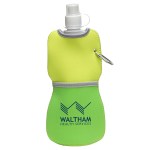 Flex Water Bottle with Neoprene Insulator that also provides a comfortable grip. Removable bottle made from Nylon+PE+PET and is BPA free and FDA certified. Has a 16 ounce capacity , easy to use pull open top and can be frozen to keep water cold. Comes with handy carabineer clip . Complies with FDA, Prop 65. 10.5″ L x 4.5″ W x 0.375″ H