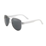 Classic aviator frame with large ad space on the temples. Features dark, ultraviolet protective lenses with UV 400 rating to protect your eyes from the bright sun. 2″ H x 5 1/2″ W