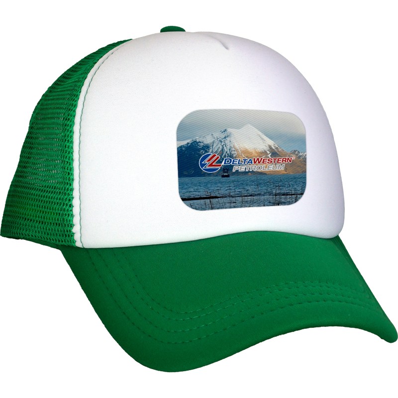 Colorful trucker-style hat with foam crown and mesh back panels, Adjustable snapback closure, one size fits all design, Emblem shapes available: Circle, Hexagon, Oval, Pentagon, Rectangle