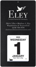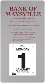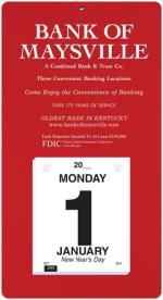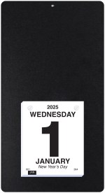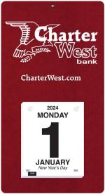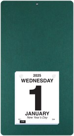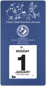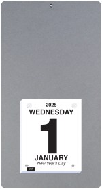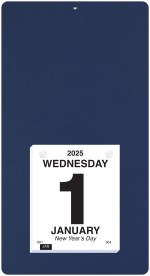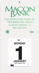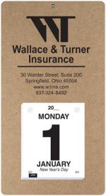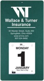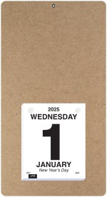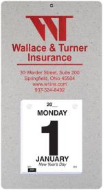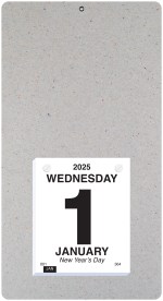 This calendar features a heavyweight paperboard back with 4 round corners and a metal reinforced eyelet for hanging. Calendar pad has 365 white offset sheets pre-printed in black only. The pad is mounted to the board with 2 white posts. 7″ L x 13″ L