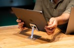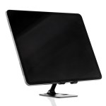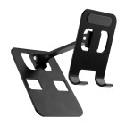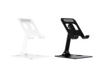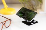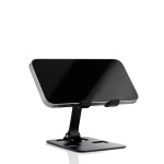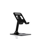 Folding aluminum media device stand with rubber panel to keep in place. Holds a variety of phones and tablets. Complies with ASTM, CPSIA, C-TPAT, FDA. 4.84″ W