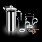 Spectacular Stainless Steel French Coffee Press Set. Restaurant Quality 18/8 Stainless Steel makes this an exquisite gift that will be cherished for years to come. Available with 2 or 4 coffee mugs. Other styles available.