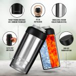 The worlds first universal can cooler! Designed to insulate nearly all 12oz and 16oz cans and bottles (over 500+ drinks) Non-slip Silicone bottom Silicone lid locks cans & bottles in place Keeps contents hot for 6+ hours Cup holder compatible *Does not fit Modelo bottles Patent pending Powder-coated styles (laser engraved only), Silicone rings, and straws are dishwasher safe. Glitter and graphic styles are hand wash only Double-wall vacuum-insulated Stainless Steel 1-year limited warranty Keeps. 3.125″ D x 3.125″ W x 6.375″ H