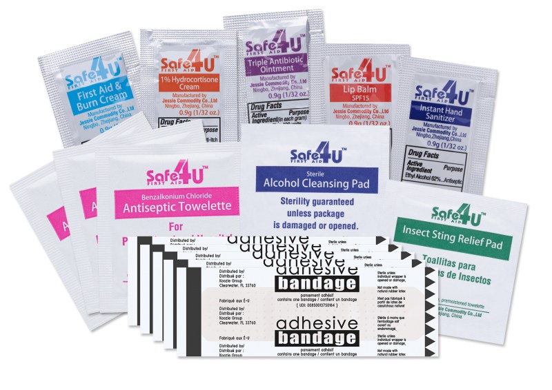 Be prepared for cuts, scrapes, and more on the go with this convenient first-aid kit! It includes bandages, antiseptic wipes, an alcohol cleansing cloth, first-aid cream, hand sanitizer, lip balm, and more. Everything fits neatly inside a zippered pouch that comes with a handy carabiner so you can easily take it with you wherever you go. 4.25″ W x 3.5″ H x 0.5″ D