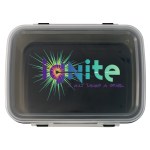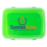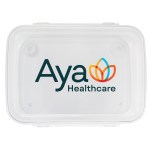Eco-friendly lunch container featuring a convenient clip top lid. The bottom is crafted from recycled PET, while the polypropylene lid is proudly made in the USA and can be customized with a full-color imprint. Please note, this item is not suitable for use in the microwave or dishwasher. To maintain its quality, hand wash only. Rest assured, this product is BPA-free for your peace of mind. Complies with FDA, Prop 65. 7.75″ L x 5.25″ H x 2.75″ W