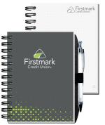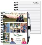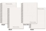 Our Impression Journal features a white 15 pt. front cover with a protective gloss coating and 80 pages of recycled 60 Lb. white offset inside sheets with black logo and rules, graph, or euro dot printed on the front of each sheet. Recycled symbol is printed in the lower right corner and the back of each sheet is blank. Comes Wire-O bound on the left side in black with a pen safe back, pen, and 3 year calendar insert. 5″ W x 7″ H