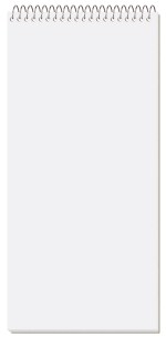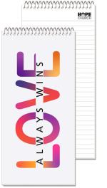 This notebook features a white 15 pt. front cover that is full color printed with a clear coat on 1 side and a white heavyweight 24 pt. back cover that is coated on 1 side. Back imprint is available on white 15 pt. only. Includes 50 Lb. white offset sheets with rules and a custom logo printed on 1 side of each sheet in 1 standard color. Comes coil bound on top. 4″ W x 8 1/4″ L