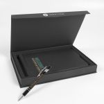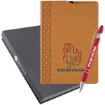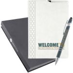 The Montabella™ Journal, paired thoughtfully with the Ultima™ Gel-Glide Pen and the Beautiful Black Saratoga Pen & Journal Gift Box, culminates in the creation of the ULTIMATE Gift Set!. This hard cover journal features a soft feeling faux leather cover with a striking tone-on-tone décor with a pen slot at top. Each journal has 80 sheets (160 ruled pages), a ribbon page marker and a pocket inside the back cover to store documents. Complies with Prop 65. 5.75″ W x 8.75″ H