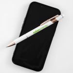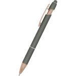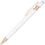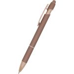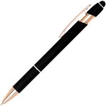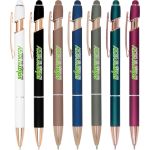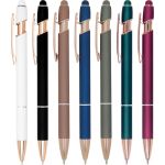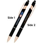 Show off Your Company Logo With This Classy Rose Gold Accent Stylus Pen printed in vivid full color! Metal pen with rose gold trim accent. Features our exclusive Softex™ finish that provides a comfortable grip. Your choice of Black or Blue Gel-Glide™ ink that is mess free and smudge proof. Matching color touchscreen stylus on the end of the pen works on your smartphone or tablet. The Ultima™ Rose Gold Accent Stylus Gel-Glide Pen will allow your full color imprint to shine. Complies with Prop 65.