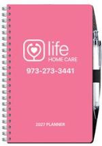 This weekly planner features a white 15 pt. front cover coated on 1 side. Includes 12 months of week-at-a-glance calendar sheets with space for notes. Comes Wire-O bound on the left side with 2 round corners, a black heavyweight back, and a pen. 5 1/4″ W x 8 1/4″ H