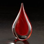 A clear glass teardrop of art glass accented by varying hues of green. The black glass base accents the presentation. 3.25″ W x 6.75″ H x 2.75″ D