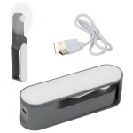 Explore the Gale Rechargable Rechargeable Fan with Swivel Handle. This fan offers a quiet brushless motor, three fan speeds, and a convenient On/Off button. Its compact size allows the fan to fold neatly into the handle. Featuring soft pliable plastic blades for safety, this fan provides up to 4 hours of runtime on a single charge. It comes with a USB-C power cable and is FCC certified. Complies with FCC, Prop 65, UN38.3. 7.875″ L x 1.5″ W x 1.25″ H