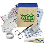 Keep safety close at hand with this compact 100% cotton canvas pouch designed as a portable first aid kit. Featuring a colorful accent band, zippered closure, and attached carabiner, it clips easily to bags or backpacks for quick access. Inside, you?ll find a well-stocked assortment of essentials for treating minor cuts and scrapes, including adhesive bandages, antiseptic towelettes, first aid cream, gauze pads, and scissors. It?s the perfect companion for home, travel, or outdoor adventures. Complies with ANSI, CPSIA, Prop 65. 6″ W x 0.25″ H x 5″ D