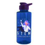 Stay hydrated on your next outdoor adventure with this 36 oz. transparent bottle featuring an extra-large capacity and a flip-top, drink-through lid with molded carry loop. Built with rigid-wall construction from durable Tritan® Renew plastic, it stands up to everyday wear. Mix-and-match bottle and lid color options make it a perfect choice for hospitals, athletic facilities, charity events, and more. Upgrade with an optional Motivational Measurement imprint on the second side, available at no extra charge when using the same screen print ink color as your side-one imprint. Bottle is molded from Tritan® Renew, which contains up to 50% post-consumer recycled polyester based on mass balance calculations. Complies with Prop 65. 3.5″ W x 10″ H x 3.5″ D