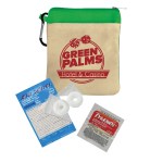 Keep essentials close at hand with this compact 100% cotton canvas pouch designed as a handy recovery kit for late nights. Featuring a colorful accent band, secure zippered closure, and an attached carabiner, it?s perfect for clipping to bags or backpacks. Inside, you?ll find must-have items like Tylenol® pain reliever, Alka-Seltzer® antacid, Purell® hand sanitizer, breath mints, antiseptic towelettes, and more for quick relief and care. Complies with ANSI, CPSIA, Prop 65. 6″ W x 0.25″ H x 5″ D