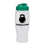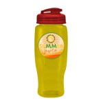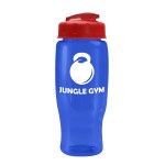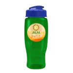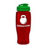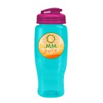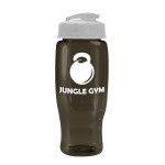 Quench your thirst while on the go with this 27 oz. transparent, contoured bottle, designed with a tapered bottom that fits most cup holders. The drink-through, flip-top lid allows for quick sips, making it a perfect companion for gyms, outdoor events, or everyday hydration. Mix and match lid and bottle colors for a customized look that matches your brand?s style. 98% of total product made from post-consumer recycled PET. 3.5″ W x 8.75″ H x 3.5″ D
