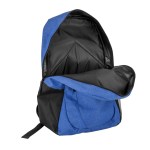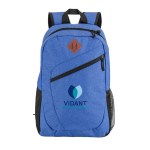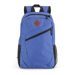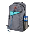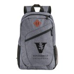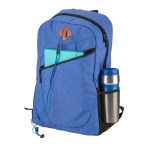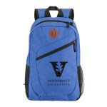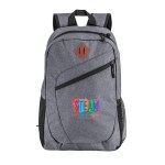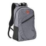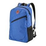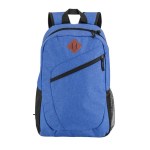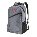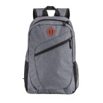 300D heathered polyester and 600D backpack with angled front pocket. PU leatherette patch; mesh water bottle pocket; padded back and adjustable shoulder straps. 5.5625″ D x 17.5″ H x 11.5″ W