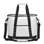 The Glacier 45C tarpaulin cooler bag with heat sealed PEVA-insulated lining holds up to 24 cans and features a water resistant exterior and zippered main compartment. It has a front pocket, 2 handles with hook and loop grip, 2 side carry handles for easy maneuvering and a removable and adjustable, 1 1/2″ x 47″ padded shoulder strap with swivel clips. Complies with Prop 65. 18″ W x 13 1/2″ H x 10″ D