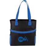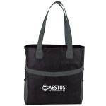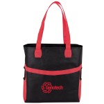 Non-woven shopping tote with side pockets large enough to hold 500ml waterbottles, 1 1/4″ x 24″ handles and 4″ gusset. Complies with Prop 65. 14″ W x 15″ H x 4″ D