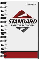 This calendar planner features an 80 Lb. gloss coated paper cover mounted to a heavy white or black paperboard back. Inside sheets are made from 60 Lb. white offset paper and include 14 months (December to January), monthly and weekly views pre-printed in blue and gray, and a white double pocket inserted in the back. Comes Wire-O bound on the left side. 5″ W x 8″ L