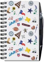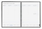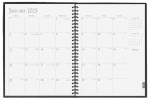 This calendar planner features an 80 Lb. gloss coated front paper cover. Inside sheets are made from 60 Lb. white offset paper and include 14 months (December to January), monthly and weekly views pre-printed in blue and gray, and a white double pocket inserted in the back. Comes Wire-O bound on the left side and is mounted to a black heavyweight pen safe back with a pen. 5″ W x 8″ L