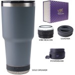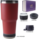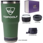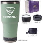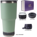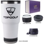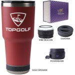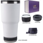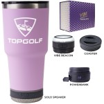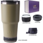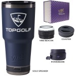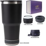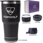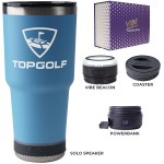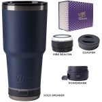 Make a wonderful and impactful impression at your next event with the Custom Go Caddy Vibe 28 oz Tumbler Kit – a comprehensive, high-tech gift set designed to elevate any active lifestyle. This kit is the ultimate choice for corporate gifts, client appreciation, and executive branded swag, perfectly suiting modern professionals and tech enthusiasts.Premium Insulated Tumbler: Includes a 28oz Vibe Tumbler with coaster base, crafted from 18/8 double-wall stainless steel, ensuring beverages stay at their ideal temperature. It’s also BPA Free.Powerful Bluetooth Speaker: Features a Solo Speaker – a robust Bluetooth 17 watt speaker with a built-in mic for 2-way calling, providing clear audio for music or calls.Portable Power: Comes with a 5000mAh portable powerbank equipped with dual output ports, keeping devices charged throughout the day.Unique iBeacon Light: Includes an iBeacon with three brightness settings and a 10′ halo of light, offering versatile utility for various settings.Luxurious