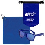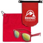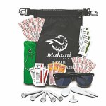 29 Piece Kit includes: 1 Golf Divot Tool, 5 Golf Tees, 2 Ball Markers polybagged together, 8 Standard Latex Free Bandages, 4 Insect Repellent Towelette, 3 Sunscreen Packets, 4 Lip Balm Packets, 1 #5130G On Heavy Duty Microfiber Golf Towel 12″ x 12″, 1 #SG103 Colored Mirror Tint Lens Sunglasses, Unimprinted components inserted into #5094 7″ W x 11″ H, 2.5 Liter Water Resistant Dry Bag. Product Size: Bag Size: 7″ W x 11″ H. Clear Front Pocket Size: 3-3/4″ W x 6″ H. 7″ W x 11″ H