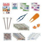 This branded golf safety and first aid kit is so darn useful and eye-catching that you’ll never hit the links without it. For starters, the portable nylon zippered bag is tear-resistant. A silver carabiner allows you to clip to your golf bag and go! Contents: 1 Blister Bandage, 2 Ball Markers, 1 Golf Divot Tool, 3 Golf Tees, 1 Pair Tweezers, 4 Bandages (3/4″ x 3″) 10 Junior Bandages, 1 Antibacterial Wipe, 2 Alcohol Prep Pads, 3 BZK Antiseptic Wipes. Complies with Prop 65. 4.75″ W x 4″ H