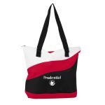 Wave Tote with a zippered closure, 26″ handles, and pen loops on the front. Complies with Prop 65. 15.75″ W x 14″ H x 3″ D