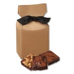 Packed with three varieties of deliciously chocolatey brownies, these fashionable packages make a great thank-you gift Make a statement with this delicious gift! The kraft gift box is foil-stamped in black and tied with a black grosgrain ribbon. Complies with CPSIA, FDA, Prop 65. 3.5″ L x 2″ W x 6″ H