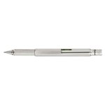 Twist-action ballpoint with textured metal grip, spirit level, 3″ ruler, small Phillips and flathead screwdriver bits in top. Complies with Prop 65. 1/2″ W x 5 1/2″ H x 3/8″ D