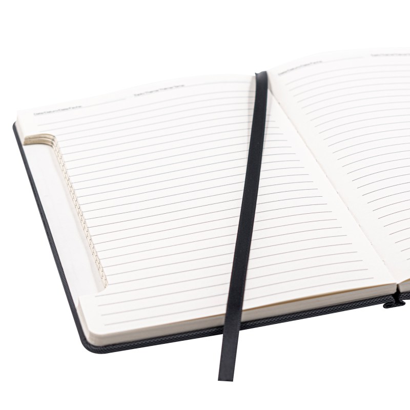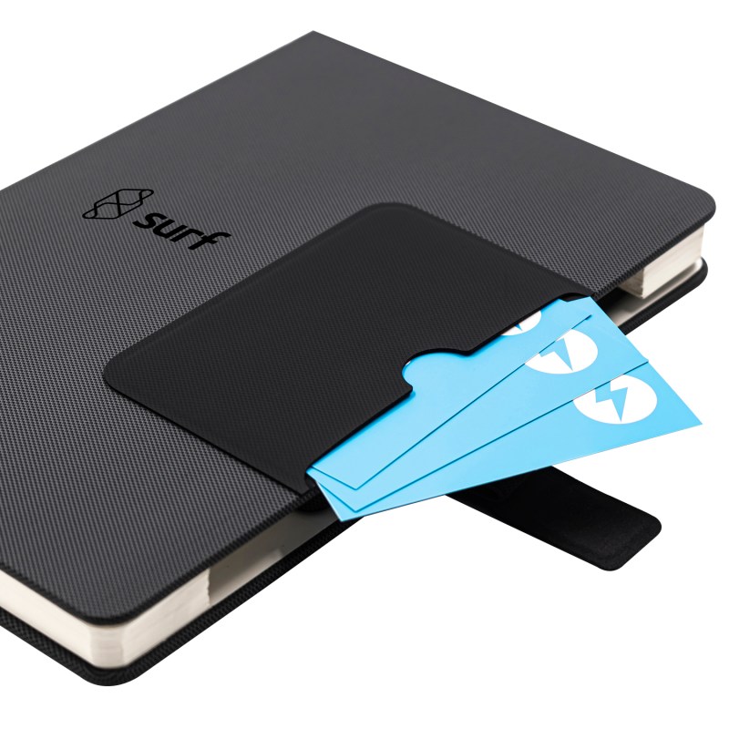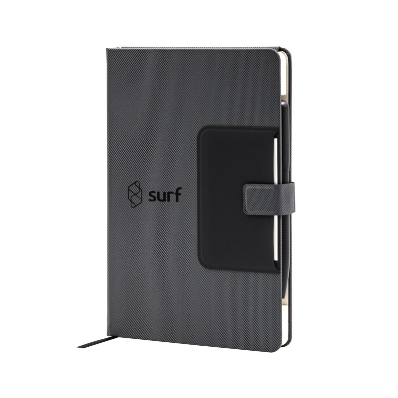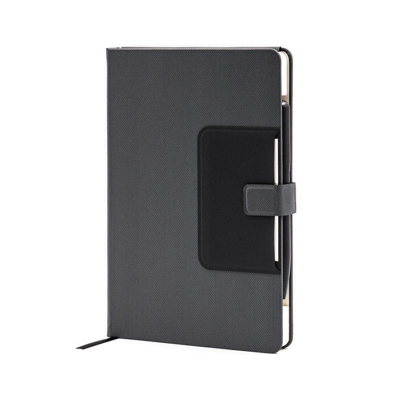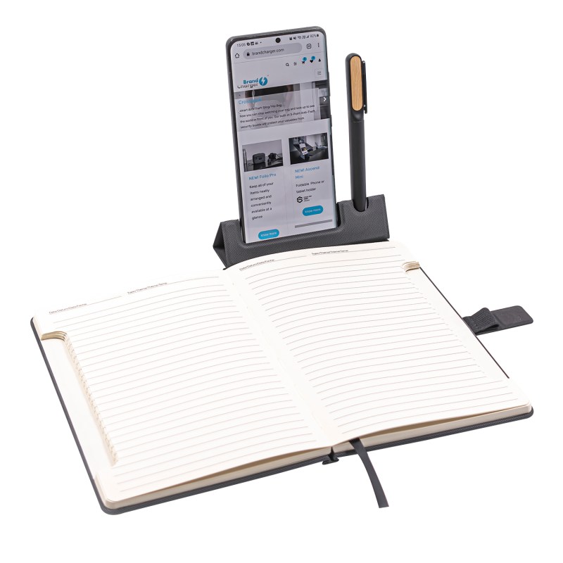 This futuristic hardcover notebook features an integrated pen compartment, bookmark ribbon, and a fold-out stand for a standard size phone and pen. This A5 ruled notebook with 192 pages of 80 gsm, acid free, ivory colored paper also features a magnetic clasp and opens flat thanks to threadstitch binding. 5.625″ W x 8.375″ H x 0.75″ D